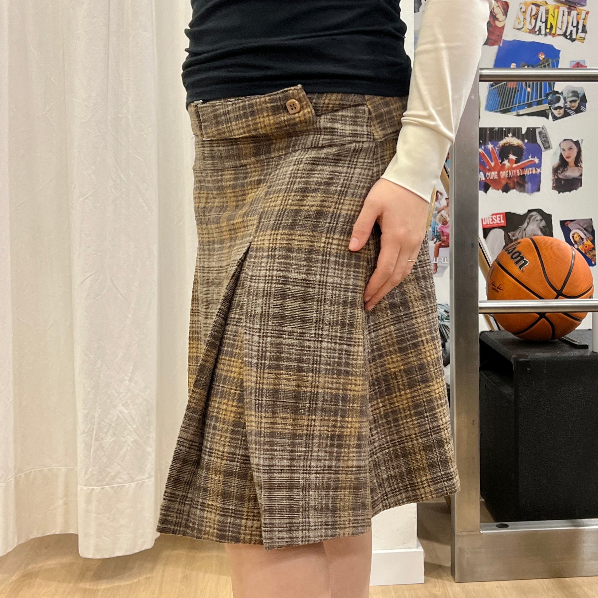 gonna midi plissettata in lana marrone a quadri ‘00s