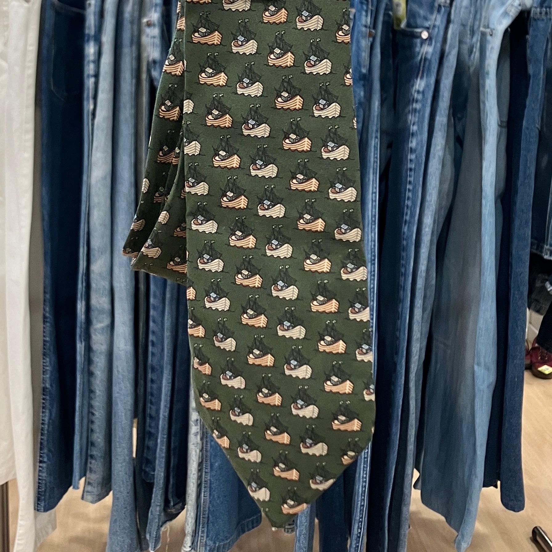 hermes 90s army green silk tie with sailing boats print